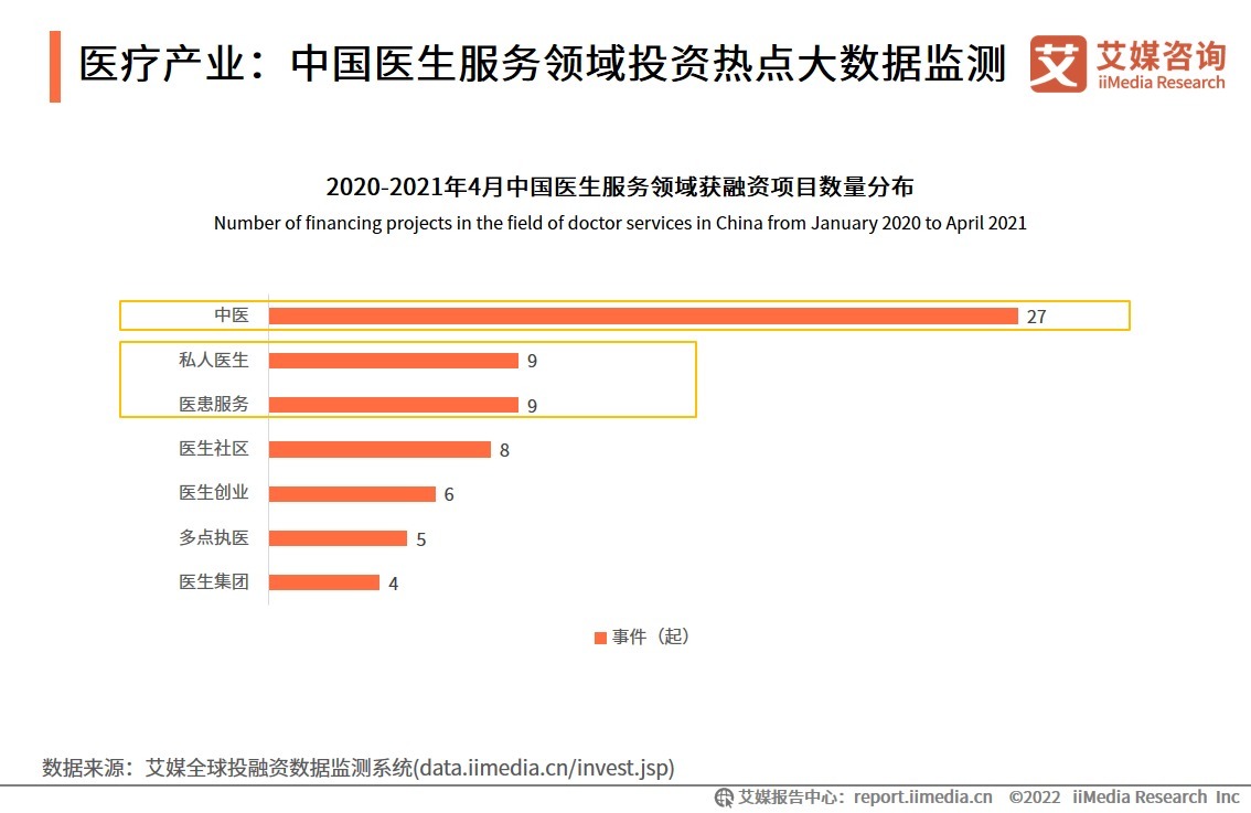 在多元办医的主体中,民营医院是社会资本进入的重要撬动点,而医生集团以及高端医疗服务是受关注的二级市场。2020-2021年4月中国医生服务类投资项目数分布中,中医领域获得资本关注度最高,有最多项目获得融资,而私人医生、医患服务和医生社区是值得关注的新的投资增长点。