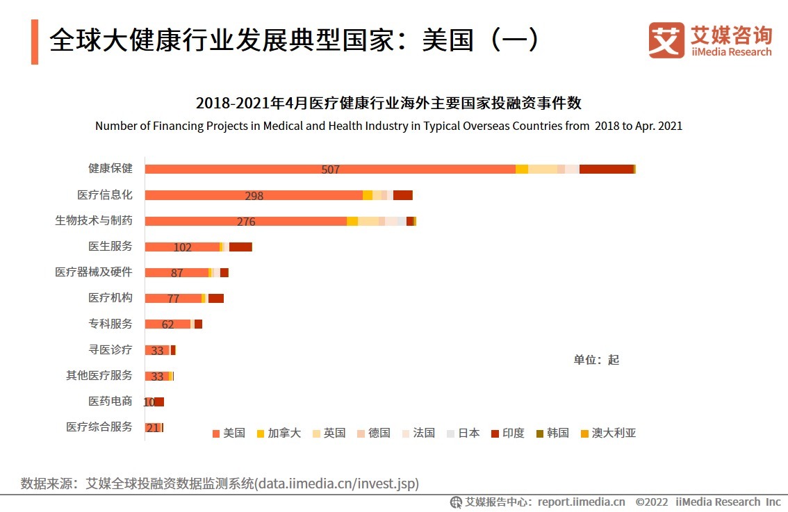 iiMedia Research(艾媒咨询)数据显示,美国在大健康产业各细分领域的投资比重都比较大,其中,健康保健、医疗信息化和生物技术与制药是投资热度较高的领域。
