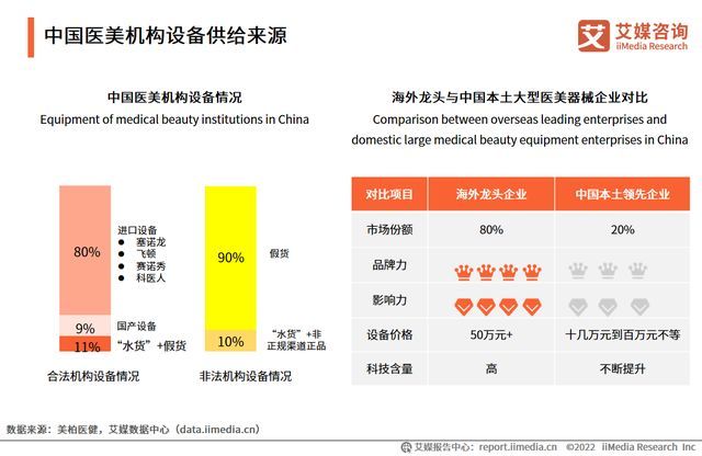 中国医美器械产业总体起步落后于欧美发达国家,目前国内正规医美机构设备的市场份额80%由进口商占据,高端市场被飞顿、塞诺龙等海外龙头企业凭借强大的研发能力、品牌力和影响力所抢占,国产品牌大多占据的是中低端市场。同时,在合法或非法机构中假货和“水货”问题都同样存在。
