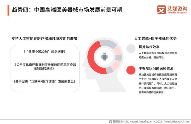 近年来,国家出台多项政策鼓励基层国产医疗器械创新,同时为了响应中央对国产医疗器械的支持,多省市政府采购政策明确限制采购进口医疗器械,鼓励采购国产医疗,促进包括医美器械在内的国产医疗器械的发展。艾媒咨询分析师认为,国家政策鼓励国产医疗器械的创新与发展,医美器械作为其分支将会受益。此外,中国本土医美器械厂商研发实力不断增强,亦会加快进口替代脚步。